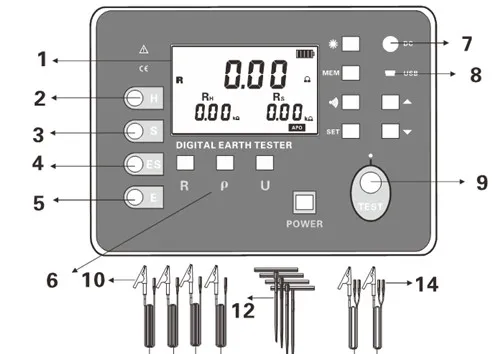 10.开关机键 11. 安全鳄鱼夹 12. 测试线(红黑各2条)