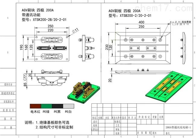 200A四极刷板刷块带通讯功能充电刷 基板采用电木或PE材料: 电木:具有较高的机械强度、良好的绝缘性,耐热、耐腐蚀; P E:即超高分子量聚乙烯,是综合性能较好的工程塑料,其耐磨、抗冲击、耐腐蚀、自润滑、吸收冲击能力较好; 四种颜色:电木红、绿色、白色、黑色可选择。 刷块电极(碳刷):铜碳合金,具有优良的导电性和耐磨、自润滑性刷板。 刷板电极(T2紫铜):纯度高,导电性能佳,原色和防氧化处理