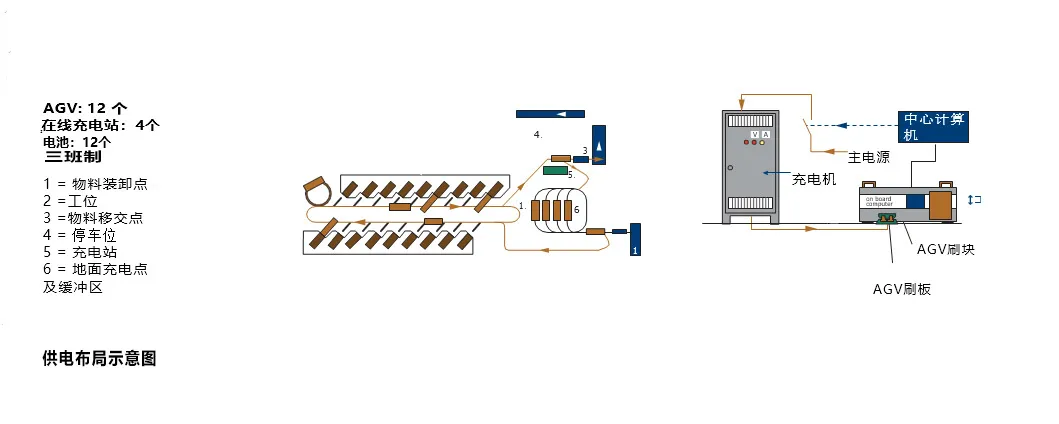 为取得良好效果,必须保证自动引导小车(以下简称AGV)的高利用率。因此,AGV驱动电池和电池充电就成为一个问题。随着大功率电池的发展,现在能够允许电池在几秒钟内进行快速充电。这一技术使得AGV在生产中不用移出生产线就可以完成充电。电池充电装置可以安装在整个生产过程系统中允许AGV停止的任意地方(比如分段运输区、转向区、装载停止区等)。注意标识应当尽可能的与已有的布局形成一体。