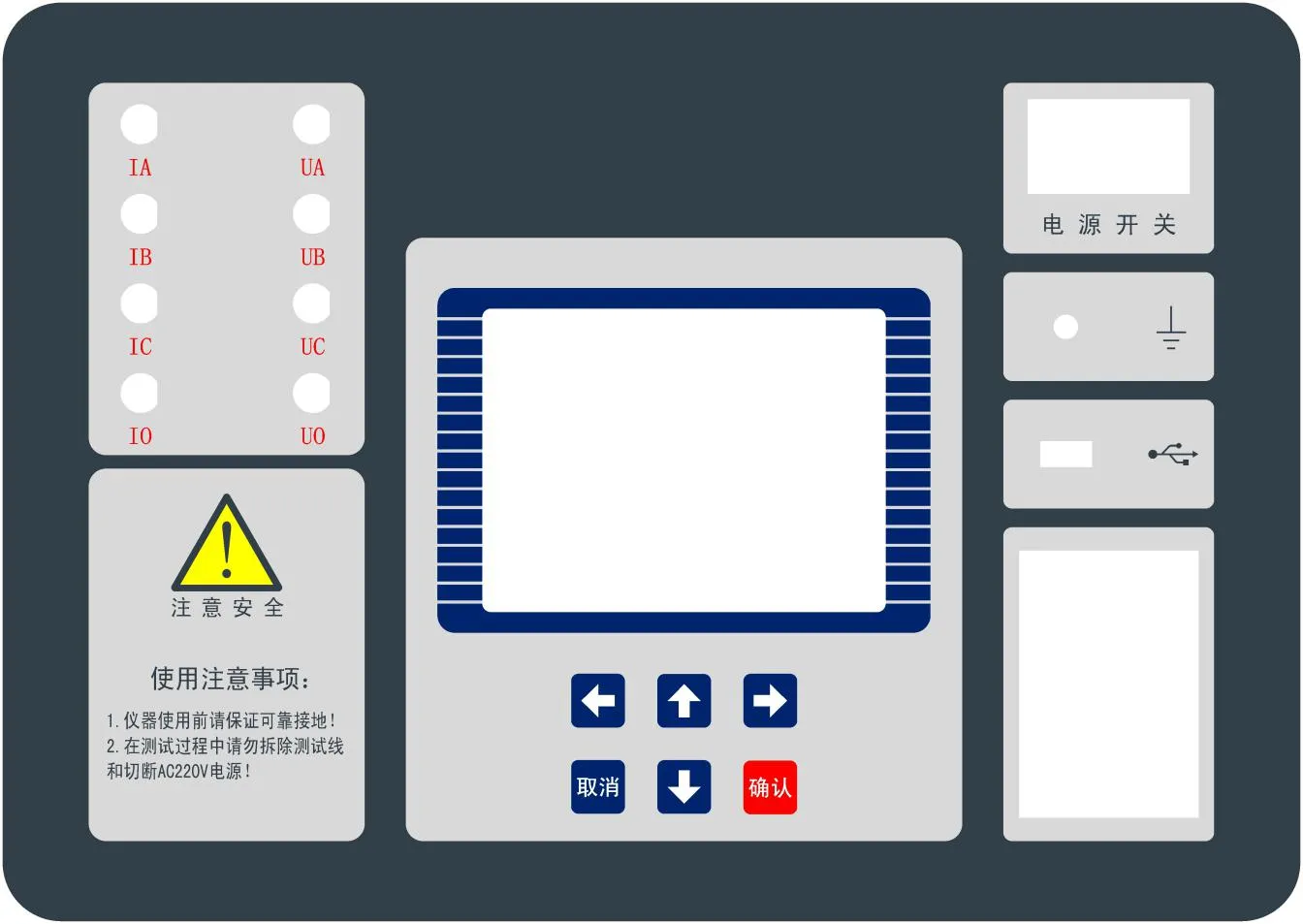 4.1 测试接线区: 黄、绿、红、黑4色接线座,分别对应A、B、C三相与中性点O,和测试线(黄、绿、红、黑)棒弹侧对应连接,测试线另一端有黄、绿、红、黑4色测试钳,可接变压器高、中、低压任一绕组(如无中性点O套管,将黑色测试钳悬空即可)。
