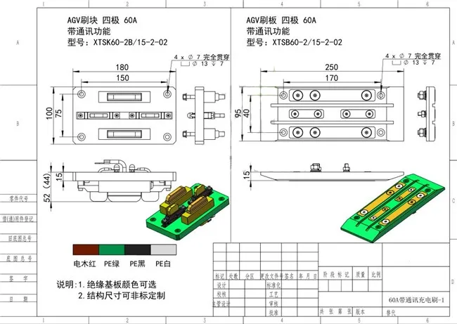 60A四极刷板刷块带通讯功能 基板采用电木或PE材料: 电木:具有较高的机械强度、良好的绝缘性,耐热、耐腐蚀; P E:即超高分子量聚乙烯,是综合性能较好的工程塑料,其耐磨、抗冲击、耐腐蚀、自润滑、吸收冲击能力较好; 四种颜色:电木红、绿色、白色、黑色可选择。 刷块电极(碳刷):铜碳合金,具有优良的导电性和耐磨、自润滑性刷板。 刷板电极(T2紫铜):纯度高,导电性能佳,原色和防氧化处理