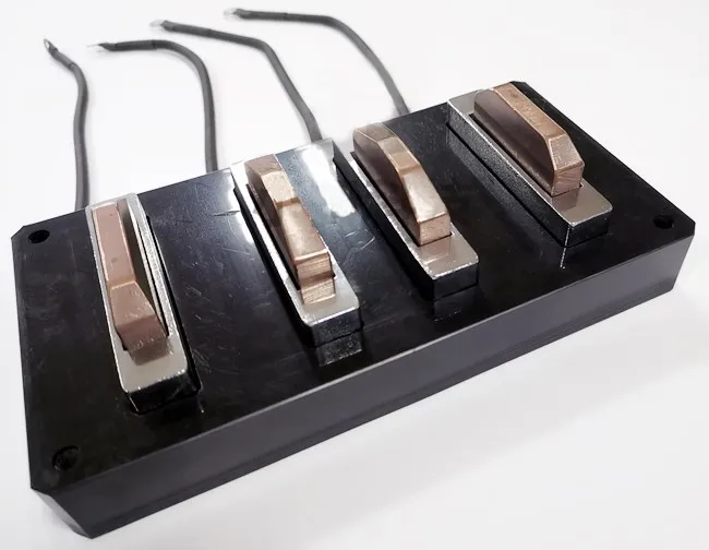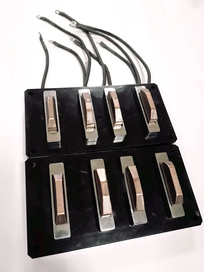 四极-60A刷板刷块带通讯功能 采用电木或PE材料: 电木:具有较高的机械强度、良好的绝缘性,耐热、耐腐蚀; P E:即超高分子量聚乙烯,是综合性能较好的工程塑料,其耐磨、抗冲击、耐腐蚀、自润滑、吸收冲击能力较好; 四种颜色:电木红、绿色、白色、黑色可选择。 刷块电极(碳刷):铜碳合金,具有优良的导电性和耐磨、自润滑性刷板。 刷板电极(T2紫铜):纯度高,导电性能佳,原色和防氧化处理